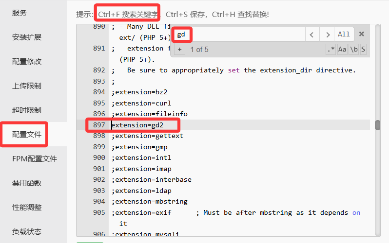 然后修改配置:搜索extension=openssl 和extension=gd2 分别删除掉;符号 保存,然后清理缓存,最好是重启一下PHP程序。
