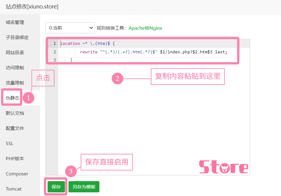 暂时只介绍Nginx1. 在配置文件伪静态下新增如下内容: